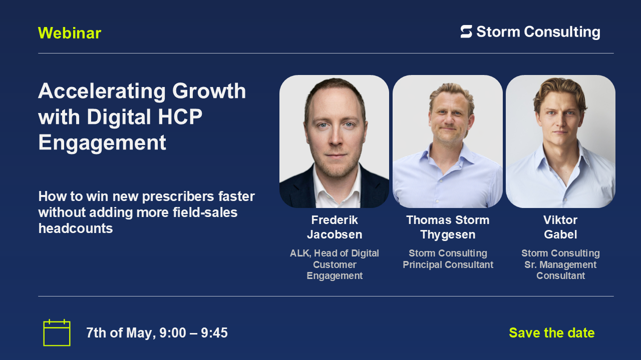 In this session, Frederik Jacobsen (Head of Digital Customer Engagement at ALK) joins Thomas and Viktor from Storm Consulting to discuss the increasing need to reframe Life Science companies GTM towards a more digital-driven HCP engagement model (DHE) and how it helps accelerate growth while lowering sales costs.